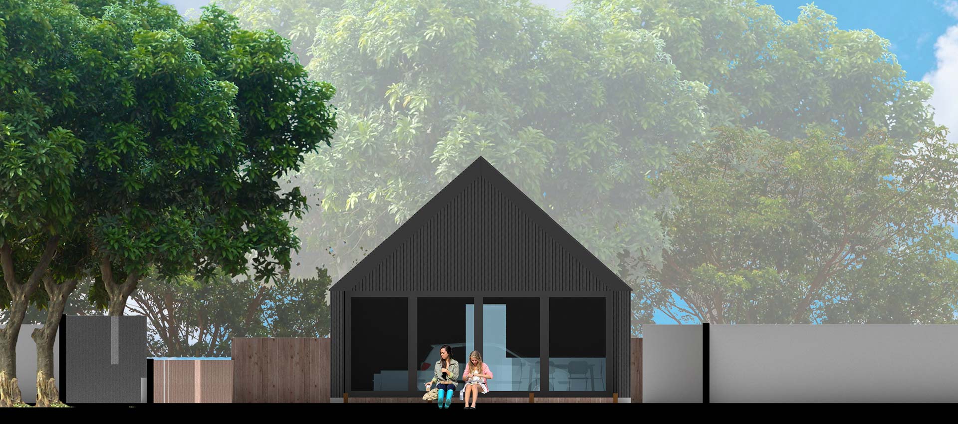 The bungalow has been designed in a simple, classic gabled building form with a restrained pallet of materials using black profiled cladding.