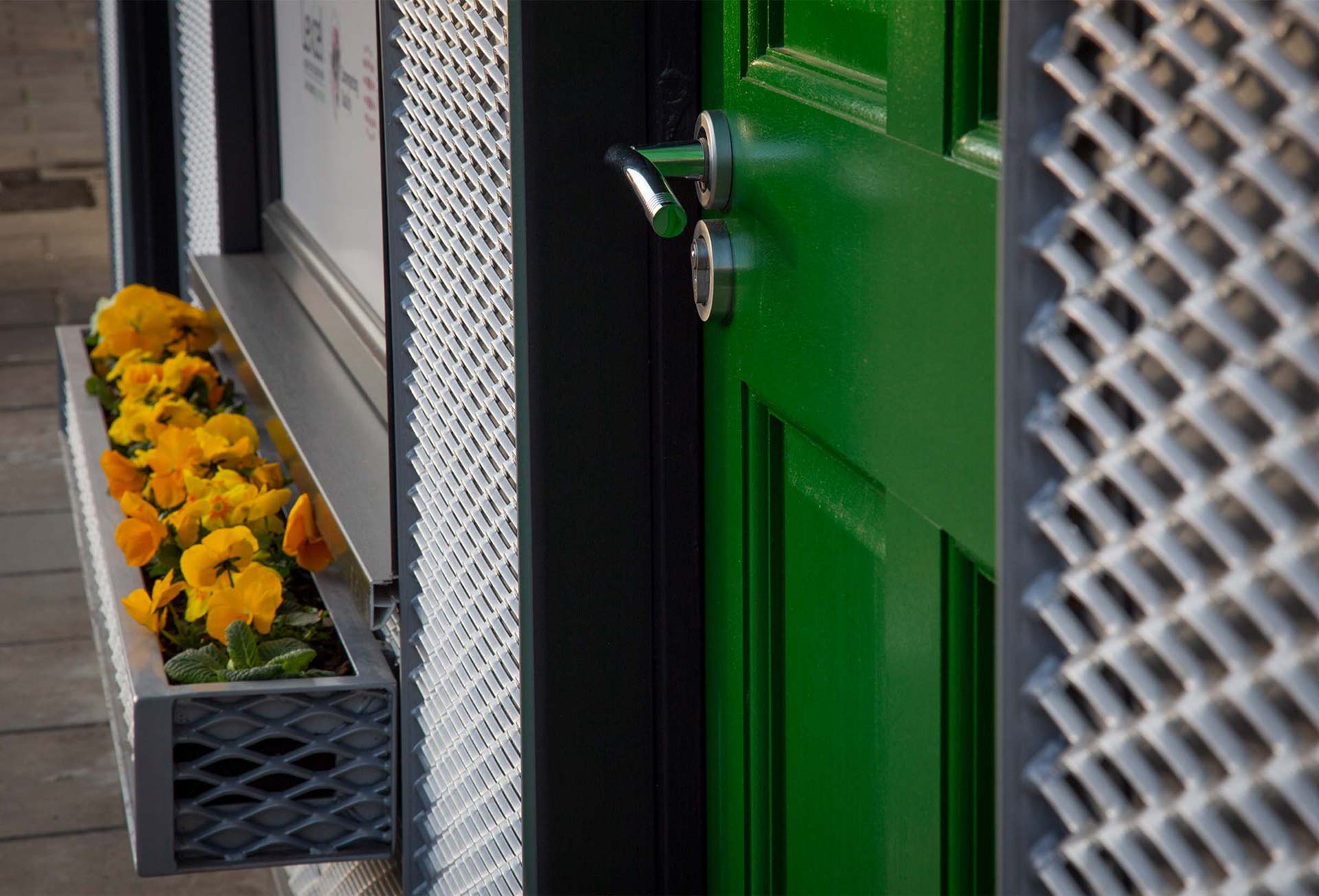 The expanded metal mesh at the ground floor (normally used in large scale commercial or industrial buildings) brings together the delicacy and intricacy of the texture and transparency of the woven steel and combines that with an industrial edge and robustness which is required at street level in a town or city centre.