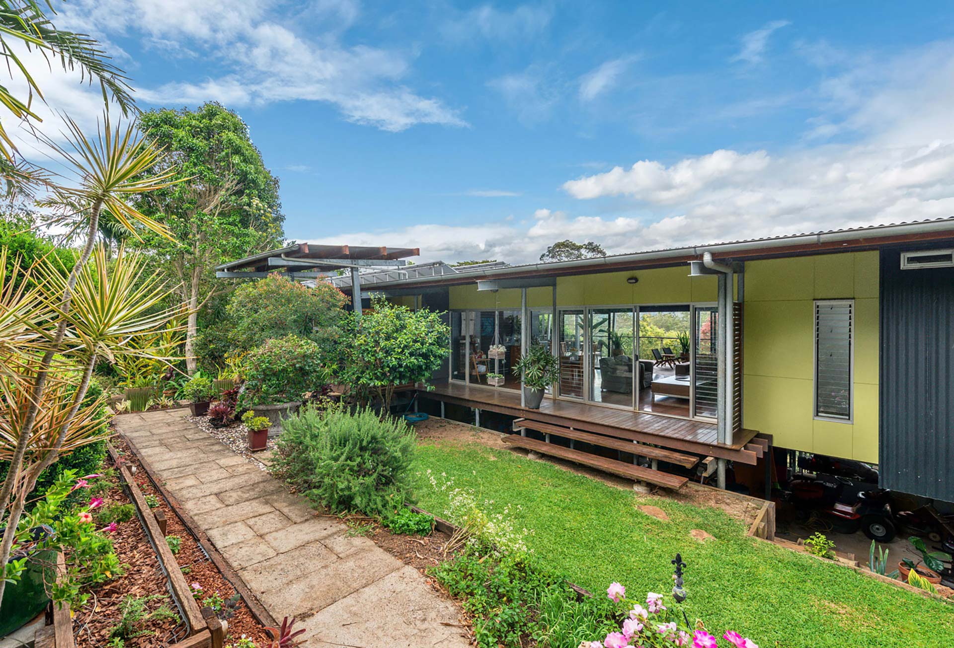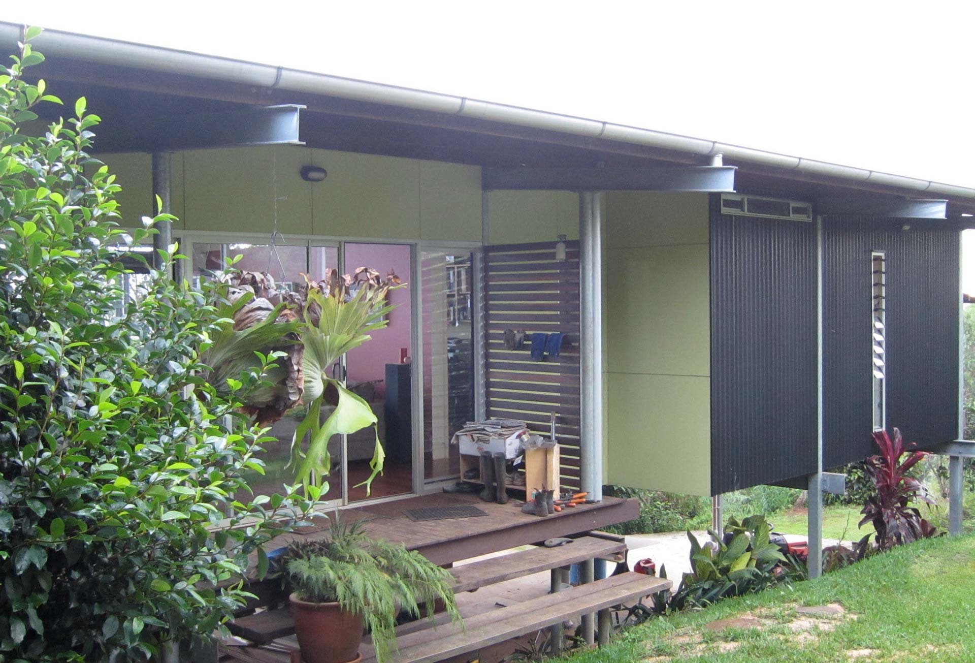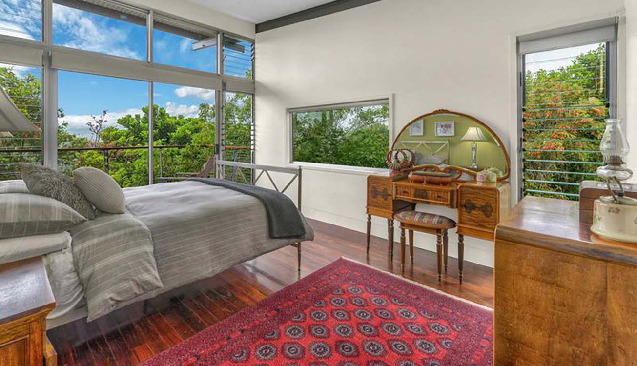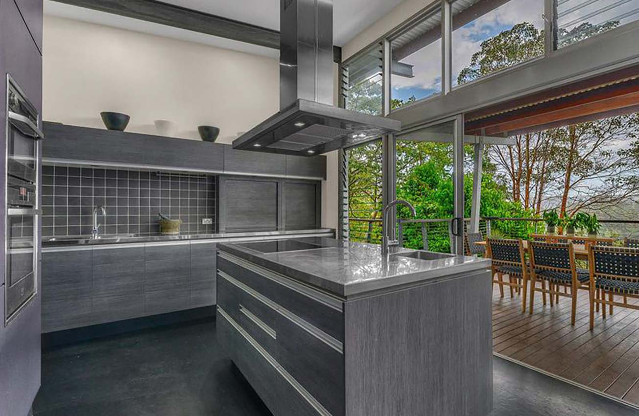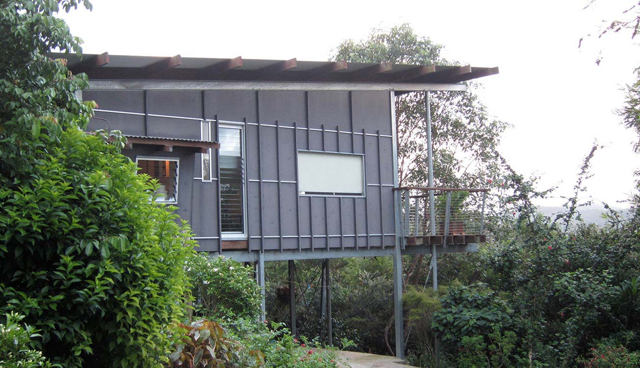 This design is constructed from a more robust steel frame with slender stilts lifting the living spaces high above ground level to gain the ease and practicality of single floor living. The access from the rear garage and driveway is level with the natural ground while the front of the building, with a large deck running the full length of the house, is perched about 4 metres above the sloping ground. The deck, offering stunning panoramic rural views across the large acreage and beyond to Mount Coot-tha, is an important part of the family living space and, along with the open plan layout benefits from cool, cross-flow prevailing breezes from the north .