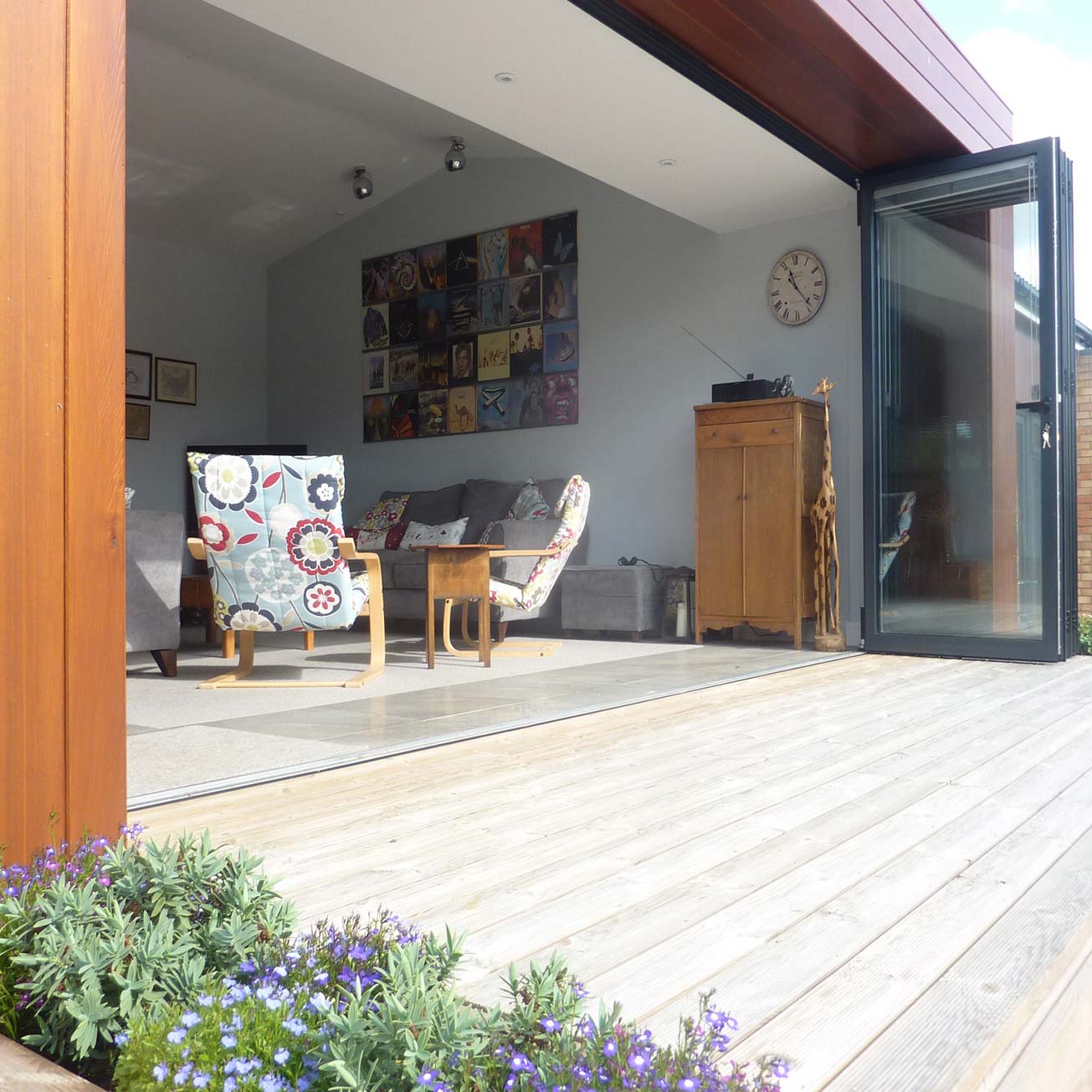 Vibrant and contemporary spaces were created both inside and out following the renovation of an existing 1960s bungalow in the Suffolk market town of Woodbridge.