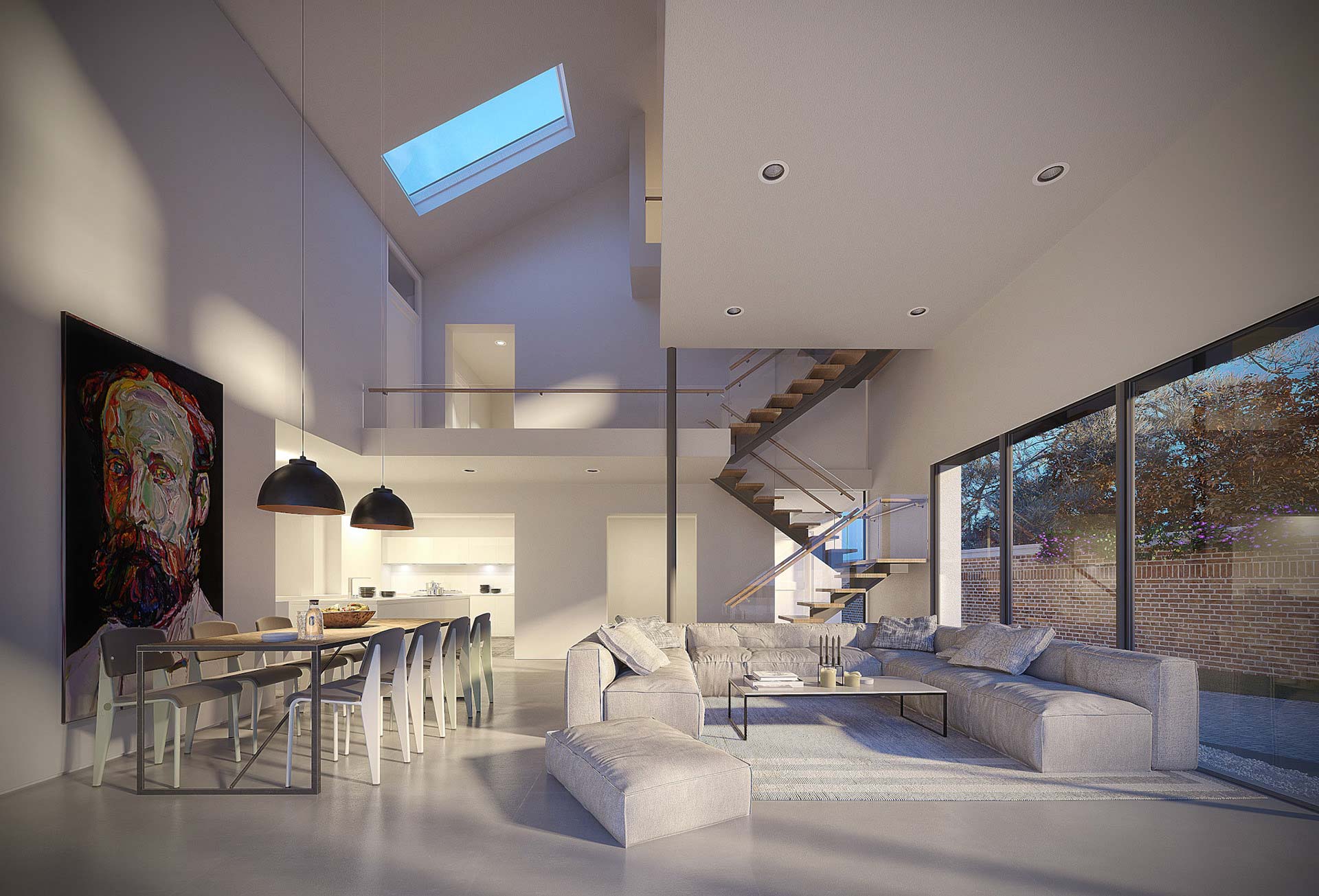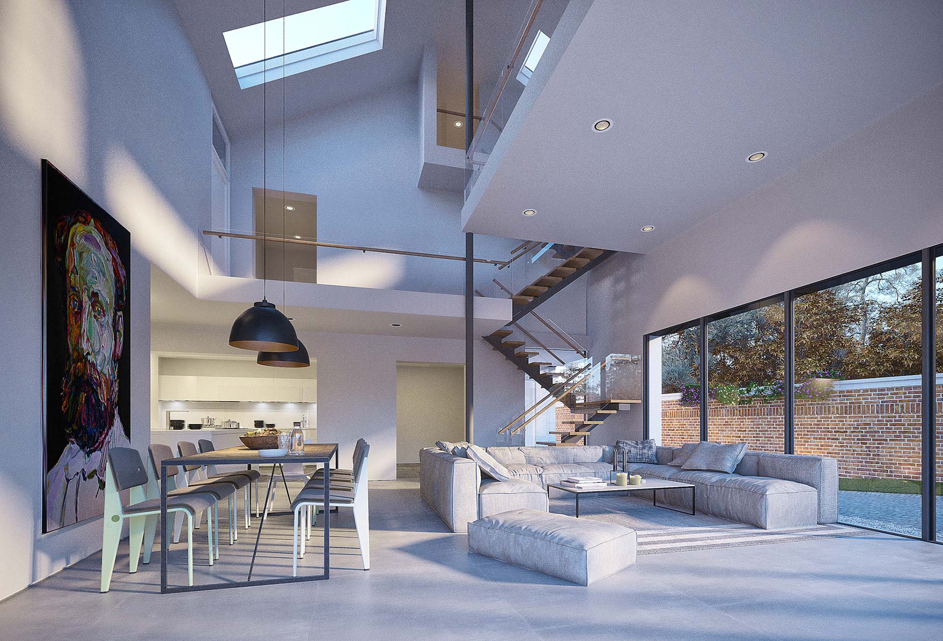 With a design brief to increase the living area of this semi-detached cottage, the plans incorporated the addition of a generous, open-plan space focussing on the view of the stunning garden. Glazed walls and skylights increase the natural daylight that floods into the contemporary space and the clean lines of the glazed banisters vanish in the distance.
